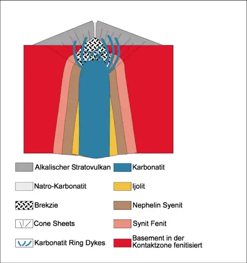 • miaskitische Alkaligesteinsassoziation (vorherrschend): Aluminiumüberschuss bei gleichzeitiger Verarmung an Alkalioxiden und Zr, jedoch Anreicherung an FeOCaOMgO.