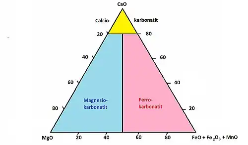 Karbonatite mit einem SiO2-Gehalt < 20 Masseprozent werden wie folgt unterteilt (siehe nebenstehende Abbildung):