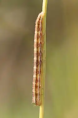 Erwachsene Raupen variieren farblich von graugrün über gelbgrau bis zu rötlich grau und zeigen mehrere gewellte, helle Längslinien. Rücken-, Nebenrücken- und Seitenlinien sind weißlich gefärbt. Sie haben außerdem eine feine, kurze, borstenartige Behaarung.