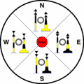 - Westen: gelb-schwarz-gelb; beide Kegel stehen mit der Spitze zueinander (optisch wie der um 90° rotierte Buchstabe „W“ für Westen), Gruppen von 9 Blitzen.[2]