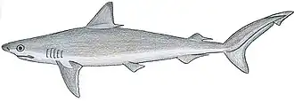 Er besitzt eine Afterflosse und zwei Rückenflossen. Dabei ist die erste Rückenflosse deutlich größer als die zweite und liegt leicht vor oder über den freien Enden der Brustflossen während die zweite erst hinter der Analflosse entspringt. Die Analflosse ist etwas größer als die zweite Rückenflosse. Die Schwanzflosse besitzt einen verhältnismäßig kurzen unteren und langen oberen Lobus mit deutlichem Endlappen. Wie alle Arten der Gattung besitzen die Tiere fünf Kiemenspalten und haben kein Spritzloch, die 4. und 5. Kiemenspalte befinden sich oberhalb des Brustflossenansatzes.