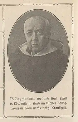 Auf Wunsch der Oberen wurde Löwenstein entgegen seinem ursprünglichen Entschluss am 8. Dezember 1909 zum Priester geweiht, und zwar vom Erzbischof von Köln, Anton Kardinal Fischer. 1920 versetzte man P. Raymundus nach Köln, wo er am 8. November 1921 im Dominikanerkloster Heilig Kreuz[6] verstarb. Die Beisetzung erfolgte in der Familiengrablege, die sich im fränkischen Kloster Engelberg über dem Main befindet.
