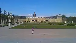 Karl Wilhelm entschloss sich, in dem in der Ebene gelegenen Hardtwald eine neue Residenz zu bauen. Um die Beweggründe und die Ortswahl ranken sich Legenden. Nebst Querelen mit der Durlacher Bürgerschaft,[17] hat wohl sein Streben, sich aus der Enge der Stadt und der Nähe zu seiner ungeliebten Frau zu lösen, seinen Entschluss gefördert. Am 17. Juni 1715 wurde der Grundstein für das neue Schloss gelegt. Der zentrale Bau des Schlosses und der ganzen Residenzstadt wurde der so genannte Bleiturm.[18] Von diesem Turm – in der Mitte des Schlosses – ausgehend begannen 32 Alleen, die sich wie die Markierungen einer Windrose gleichförmig nach allen Seiten entfernten. Dieser Grundriss prägt noch heute die „Fächerstadt“ Karlsruhe.