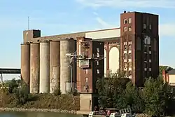 - 1929: Getreidesilos der Weizenmühle Plange in Düsseldorf, am Hafen
