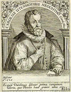 - ↑ „Dictante Karolo Anna ab Vtenhouia scribebat Vtenhouio“ in: Cornelius Schoneus 1595; vgl. Hans van de Venne: Cornelius Schoneus 1541-1611. A Bibliography of His Printed Works II. In: Humanistica Lovaniensia 33 (1984), S. 206–314, bes. S. 210; vgl. auch „Karolus Vtenhovius, Kar[oli] F[ilius] Neochthonij Dominus, dictabat“ in: Anton Dunck 1600.