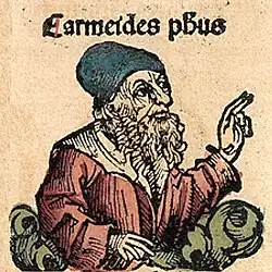 Als im 13. Jahrhundert ein neues Interesse einer breiteren Öffentlichkeit an antiker Philosophie erwachte, rückte auch Karneades wieder ins Blickfeld. Besondere Aufmerksamkeit richtete sich damals auf erbauliche und unterhaltsame Begebenheiten aus dem Leben der Denker. Autoren wie der Dominikaner Vinzenz von Beauvais und der Franziskaner Johannes Guallensis nahmen in ihre populären Handbücher anekdotisches Material über Karneades auf. Im frühen 14. Jahrhundert entstand der Liber de vita et moribus philosophorum, eine früher zu Unrecht Walter Burley zugeschriebene Sammlung von Nachrichten über antike Philosophen. In diesem außerordentlich einflussreichen Werk, das in mehrere Sprachen übersetzt wurde, ist Karneades ein Kapitel gewidmet, das sich allerdings weitgehend auf anekdotischen Stoff beschränkt.[42] Auch in der Schedelschen Weltchronik von 1493 wird Karneades kurz auf solche Weise behandelt; er erscheint dort als „Carmeides“.[43]