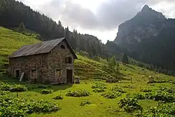 Die Landwirtschaft ist am Karnischen Hauptkamm bis auf wenige Ausnahmen auf die Weidenutzung der Almen beschränkt. Abseits der Karstgebiete bieten die Böden und die hohe Wasserverfügbarkeit gute Voraussetzungen für die Weidewirtschaft. Meistens werden auf Almen keine Milchkühe mehr gehalten, sondern ausschließlich Galtvieh. Nur selten wird Milch vor Ort verarbeitet, wie etwa auf der Frondell Alm, wo Gailtaler Almkäse hergestellt wird. Auch werden Pferde und Schafe auf den Almen gehalten. Die Nutzung von Almen an der Nordseite ist seit dem 14. Jahrhundert belegt. Im Görzer Urbar von 1374 werden unter anderem die Mauthner Alm, Tschintemuntalm, Garnitzenalm, Straniger Alm sowie die Feistritzer Alm erwähnt.[49] Auf der Südseite, in Karnien, ist die Almwirtschaft seit dem 8. Jahrhundert belegt.[50] Die Almen sind meist Gemeinschaftsalmen oder Privatalmen. Servitutsalmen spielen eine untergeordnete Rolle. Es fand oft ein grenzüberschreitender Verkehr von Vieh und Gütern statt. Viele Gailtaler Almen wurden etwa an italienische Senner verpachtet, die ihr Vieh von Süden auftrieben und Käse nach Friulaner Art produzierten. Die Zahl der aufgetriebenen Nutztiere war im 19. und frühen 20. Jahrhundert im Vergleich zu heute deutlich größer. Während der beiden Weltkriege wurden viele Almhütten zerstört und die Almbauern oft enteignet. Mit dem Wandel der Landwirtschaft im 20. Jahrhundert waren die Almen für die Höfe im Tal nicht mehr überlebensnotwendig, und der Almauftrieb im Sommer wurde häufig eingestellt.[49]