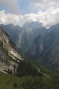 Aufgrund der großen Höhenunterschiede von der Tallage bis in die Gipfelregionen bildet sich in jeder Höhenstufe eine entsprechende Vegetation. Die montane Stufe entspricht dem Bereich der Fichten-Tannen-Buchen-Wälder als Klimaxvegetation. Mit zunehmender Höhe werden die Buchen von Fichten und Lärchen abgelöst, die auch die Waldgrenze bilden. Über der Waldgrenze bildet die Bergkiefer über Kalk und die Grünerle über Silikat oft einen typischen Krummholzbereich, der in Gräben und Schutthalden auch unterhalb der Waldgrenze vorkommen kann.[23]