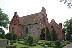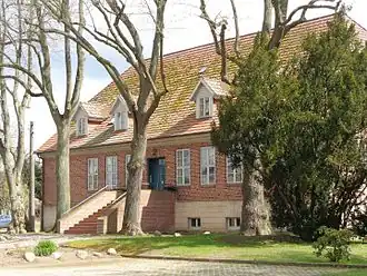- Dorfkirche in Backstein-Bauweise ohne Turm, umgeben vom Kirchhof der Gemeinde. Vor der Trauerkapelle steht seit 1988 das Bronzedenkmal Die Trauernde von Wilhelm Wandschneider. Die Frauengestalt weist viele Einschüsse aus Handfeuerwaffen auf. Sie stand ursprünglich vor dem Mausoleum der Familie Schlutius.