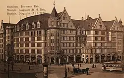 Das traditionsreiche, denkmalgeschützte Kaufhaus wurde in den Jahren 1904 bis 1905 nach Entwürfen des Münchener Architekten Max Littmann für die Warenhauskette Hermann Tietz gegenüber dem Hauptbahnhof errichtet und am 14. März 1905 eröffnet. In der Gestaltung des Baukörpers bediente sich Littmann, dem historisierenden Zeitgeschmack folgend, Elementen der deutschen Renaissance. Das ehemalige Warenhaus Tietz ist ein fünfgeschossiger Walmdachbau mit Vorsprüngen, Treppentürmen, Giebeln und Gauben. Es wurde in Eisenbeton-Skelettbauweise mit reduziert historisierenden Fassadengestaltungen, teils mit Muschelkalk erbaut. Der plastische Fassadendekor stammt von Julius Seidler, Jakob Bradl und Fidel Enderle.