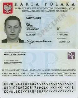 Seit 2008 ist die Beantragung einer „Karta Polaka“ (Polen-Karte) für ethnische Polen möglich, die Bürger anderer Staaten bzw. Apatriden sind (bis 2019 waren nur Bürger der Nachfolgestaaten der ehemaligen Sowjetunion berechtigt) und nachweisen, dass sie polnische Vorfahren und Sprachkenntnisse haben, sowie die polnische Volkszugehörigkeit schriftlich deklarieren. Die Inhaber der Karte haben keine polnische Staatsbürgerschaft, aber verschiedene Privilegien gegenüber anderen Ausländern, bspw. bei Einreisevisum, Erwerbstätigkeit, Ausbildung oder Gesundheitsversorgung in Polen.[34][35]