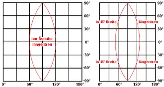 Das Ergebnis ist ein Netz sich kreuzender Linien, die den Breiten- und Längenkreisen auf der Erde entsprechen. Dabei kommt es unvermeidlich zu Verzerrungen, weil sich eine zweifach gekrümmte Fläche (die Erdkugel oder das Erdellipsoid) nicht ohne Formänderungen auf eine Ebene übertragen lässt -- siehe das Einreißen einer Orangenschale, wenn man sie auf dem Teller flachdrückt.