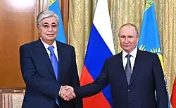 Im Jahr 2013 löste Präsident Wladimir Putin eine Kontroverse aus, als er behauptete, dass „die Kasachen nie eine Staatlichkeit hatten“.[13] Putins Äußerungen zu diesem Thema führten zu einer scharfen Reaktion von Präsident Nasarbajew, der ankündigte, dass das Land den 550. Jahrestag des kasachischen Khanats feiern würde, was Putins Behauptung, dass eine kasachische Nation nie existiert habe, widerlegte. Außerdem drohte er mit dem Austritt aus der Eurasischen Wirtschaftsunion und erklärte, die Unabhängigkeit des Landes sei sein „wertvollster Schatz“ und die Kasachen würden ihre Unabhängigkeit „niemals aufgeben“. Putin hatte den Zusammenbruch der Sowjetunion mehrmals als Katastrophe bezeichnet und die Annexion der Krim 2014 löste in Kasachstan Befürchtungen über einen möglichen Anschluss des mehrheitlich russisch besiedelten Norden Kasachstans an Russland im Stile der Krim aus.[14] 2019 kam in Kasachstan Qassym-Schomart Toqajew als Nachfolger von Nasarbajew an die Macht, welcher die engen Beziehungen zu Russland vorerst weiterführte. Im Januar 2022 begannen schwere Unruhen in Kasachstan. Auf Ersuchen der Regierung Tokajew half Russland im Rahmen eines Einsatzes der Staaten der OVKS dabei, die regierungsfeindlichen Proteste niederzuschlagen.[15]