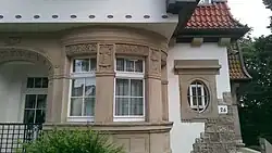 Durch seine vielfältigen Details wie den Bruchsteinsockel mit spitzgratigen Ausfugungen, unterschiedliche Einfassungen der Fenster in Werkstein, Holz und Putz, den mit Symbolen versehenen, kreisförmigen Zierputzelementen im Straßengiebel und den differenziert gestalteten Holzsprossenfenstern mit zum Teil farbigen Bleiverglasungen zeigt das Haus eine vielfältige, aber dennoch geschlossene Gestaltung. Hervorzuheben sind die qualitätvollen Verzierungen der straßenseitigen Erdgeschossfenster mit figürlichen Darstellungen der vier Jahreszeiten durch arbeitende Personen und geometrische Reliefs in den Stürzen.