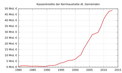 Durch den Rückgang der kommunalen Einnahmen zwischen 1992 und 2006 sind Kassenkredite, wie der Deutsche Städtetag betont,[4] in diesem Zeitraum regelrecht explodiert. Sie stiegen von etwa 1,2 Milliarden Euro 1992 auf 28,4 Milliarden Euro im Jahre 2007 und machen inzwischen 26,4 % aller kommunalen Schulden aus;[5] Gründe waren vor allem der starke Rückgang der Gewerbesteuereinnahmen bei gleichzeitigem Anstieg der Sozialausgaben – beide Posten werden im Verwaltungshaushalt veranschlagt. 2012 erreichten Kassenkredite mit 48 Mrd. Euro einen neuen Negativrekord.[6]