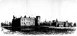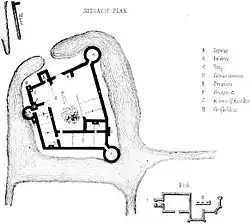 Die Kernburg ist vollständig von einem Wassergraben umgeben. An diesem befindet sich, unmittelbar der Kernburg gegenüberliegend, die Kirche der Anlage. Auch die Kirche war im 19. Jahrhundert baufällig und teilweise ohne Dach.[2]