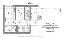 Die ab November 1909 begonnenen Arbeiten zur Errichtung des Bezirkskrankenhauses, das heute im Nordwesten Öhringens liegt, wurden von Anfang an durch den Bezirkspfleger Adolf Wolf (1879–1915), der zuletzt hauptberuflich als Oberpräzeptor am Öhringer Progymnasium arbeitete, beobachtete. Ab Sommer 1911[13] begannen die bis Januar 1912[14] dauernden eigentlichen Ausschachtungsarbeiten, wobei Wolf unter der Federführung der Reichs-Limeskommission die anschließend nicht mehr wiederholbaren Aufschlüsse am Stabsgebäude (Principia) des Kastells vornehmen konnte.[13] Wolf stellte fest, dass der Krankenhausneubau genau über der Schnittachse der beiden Hauptstraßen des Kastells, der westöstlich verlaufenden Via praetoria und der nordsüdlich angelegten Via principalis errichtet wurde.[14]