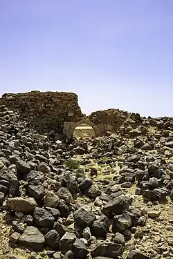 Es gibt noch eine dritte Struktur, von Domaszewski und Brünnow ebenfalls als „Turm“ interpretierten,[67] und von Parker als „nahezu verschwunden“ notiert.[68] Das aus Lehmziegeln errichtete Gebäude befindet sich rund 75 Meter östlich des südöstlichen Haupttores und misst rund 10 × 6 Meter. Mit seinen Schmalseiten ist der Bau ostwestlich orientiert. Die Mauern sind noch bis zu vier Schichten hoch erhalten, wobei jede Schicht aus Lehmziegeln besteht, die etwa 40 Zentimeter lang, 15 Zentimeter hoch und 30 Zentimeter breit sind. An einer Stelle schien es Rucker bei seiner Untersuchung, als ob der Bau ein steinernes Fundament besitzen würde.[65] Im Inneren glaubte der Archäologe dann eine von Osten nach Westen gezogene Innenwand erkennen zu können, die das Gebäude in zwei etwa gleich große Räume teilen würde.[69] Der Bau ist von zahlreichen Dachziegelfragmenten umgeben.[65] Auf der Grundlage dieser Ziegelfragmente sowie den 41 von Rucker gesammelten Keramikscherben datiert dieser Bau wahrscheinlich zeitgleich mit dem Kastell. Einen verwitterten rechteckigen Quaderstein mit einem Loch an einer Ecke fand Rucker zwei Meter von der nordöstlichen Ecke des Gebäudes entfernt. Vielleicht ist dabei an einen Türscharnierblock zu denken, möglicherweise aus dem nahegelegenen Kastell. An drei Scherben aus Ruckers Fundus konnte eine nähere diagnostische Untersuchung durchgeführt werden. Die Datierung ergab ein spätrömisches Stück, zwei frühbyzantinische Fragmente sowie 38 römisch-byzantinische Wandscherben.[69]