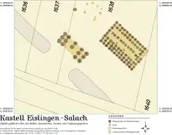 Nach den Befunden aus den kleineren Untersuchungen und der Luftbildauswertung war Eislingen-Salach ein reines Holz-Erde-Kastell mit fast rechteckigem Grundriss, das nie in Stein ausgebaut wurde. Dies spricht wohl für eine relativ kurze Nutzungsdauer. Die Innenfläche der rund 140 × 164 × 164 × 140 × 156 Meter großen Anlage[3] umfasste wohl 2,20 Hektar, was als reguläre Lagergröße für eine in diesem Fall unbekannte Kohorte gilt. An allen vier Seiten ist ein singulärer, umlaufender Spitzgraben nachgewiesen, der wie der als Holz-Erde-Konstruktion errichtete Wall an den vier Ecken abgerundet war (Spielkartenform). Vier Tore an jeder Seite ermöglichten den Zugang zum Kastell.