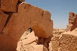 Um auf das exponierte Kastellplateau zu kommen, gab es lediglich drei Möglichkeiten. An der Südwestseite, hinauf zum rückwärtigen Kastelltor, der Porta decumana, fanden die Ausgräber unter Mackensen in den Fels geschlagene schräge, teilweise auch getreppte Zugänge. Ganz ähnlich stellte sich das Bild am südöstlichen Flanke dar. Dort lag der Aufstieg nahe der Ostecke der Prätorialfront[17] und es fand sich auf dem Fels während der Freilegung ein Denaranima der Kaiserin Julia Domna (196/211).[18] Der dritte Weg führte aus dem Tal des Wadi Tula ebenfalls zur Prätorialfront. Die Archäologen stellten rund 260 Meter nördlich des Haupttores auf den in diesem Bereich ansteigenden Erosionshängen eine rund sechs Meter breit in den Fels eingearbeitete Trasse fest. In ihrem Mittelbereich war dieser Weg als schräge Fläche angelegt, während sich an den Seiten Trittstufen zeigen.[19][18]