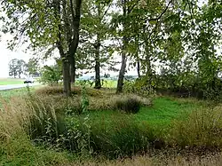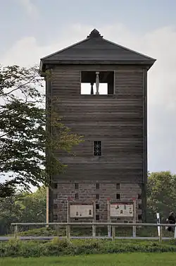 | Wp 10/15 | „Im oberen Haspel“ | ![]() Die Holzturmstelle,[A 6] die etwa zur Hälfte von der modernen Straße geschnitten wird, wurde von der Kommission zwar in ihrer Oberflächenstruktur vermessen, jedoch nicht archäologisch untersucht. Schwache, zum Teil versumpfte Spuren des Ringgrabens und des Turmhügels finden sich unmittelbar westlich der Straße in einer Buschgruppe.[11][A 7] ![]() ![]() In dem Turmhügel befindet sich ein Steinfundament, das aber neuzeitlich ist und in keinem Zusammenhang mit der antiken Bebauung steht. Der Holzturm wurde im Jahr 2010 wenige Meter nördlich rekonstruiert. Die Rekonstruktion ist weitgehend baugleich zu derjenigen bei Rainau-Buch (Wp 12/77 „Mahdholz“).