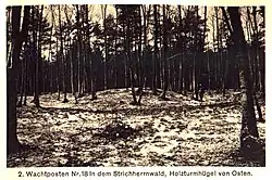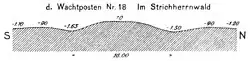 | Wp 10/18 | „Im Strichherrenwald“ | ![]() ![]() Der zur Turmstelle gehörende Steinturm wurde – wie die meisten in diesem Streckenabschnitt – bereits vor der Tätigkeitsaufnahme der Kommission zwecks Verwendung des Steinmaterials beim Straßenbau zerstört.[A 12] | ||||||