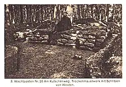 | Wp 10/20 | „Am Kutschenweg“ | ![]() ![]() Der Holzturmhügel, den die Limespalisade in 27 m östlicher Entfernung passierte, wurde 1896 von Eduard Anthes untersucht. Der Holzturm ruhte auf einem Fundament aus Trockenmauerwerk, das einen quadratischen Grundriss von 5,20 m Seitenlänge einnahm und zu Anthes Zeiten noch bis zu einer Höhe von 80 cm erhalten war. An den Ecken befanden sich 35 cm² große Aussparungen zur Aufnahme der Eckpfosten, die 1,30 m in die Tiefe versenkt waren. An allen Seiten wiesen die Mauern jeweils drei 10 cm bis 25 cm breite Schlitze auf. Das Innere des Trockenmauerwerkrechtecks war vermutlich mit Erde und Lehm verfüllt. Umgeben war der Turm von einem Ringgraben, dessen Durchmesser 15 m betrug. Das Profil des Grabens wurde nicht ermittelt. In etwa 20 m Entfernung südlich des Holzturms befand sich die Steinturmstelle, die bereits zur Zeit der Reichs-Limeskommission völlig zerstört war.[19] Die Turmstelle Wp 10/20 liegt in einem nicht öffentlich zugängigen Teil des Gräflich Erbach-Erbach'schen Wildparks. | ||||||
