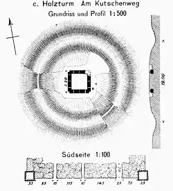 | Bauweise | c) Holz-Erde-Lager (vermutlich) b) Trockenmauer c) Mörtel-Steinmauer |