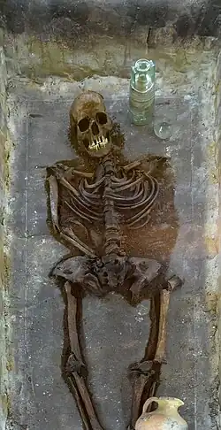 „Gräberfeld 1“ bezeichnet eine Ansammlung von insgesamt drei Gräbern. Es handelt sich um Körperbestattungen mit Beigaben, die auf den Zeitraum vom Ende des dritten bis in die erste Hälfte des vierten Jahrhunderts datiert werden.[45] Möglicherweise handelt es sich um Soldatengräber.[46]