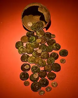Das Fundmaterial aus dem Kastell Oudenburg wird im Romeins Archeologisch Museum Oudenburg (RAM)[50] präsentiert. Ein herausragender Fund ist der 1870 entdeckte Münzschatz aus der Oudenburger Teilgemeinde Oksem, ein Hortfund, der vermutlich mit den Überfällen germanischer Piraten in den Jahren zwischen 250 und 275 im Zusammenhang steht. Der Münzschatz besteht aus dem zerbrochenen Aufbewahrungsgefäß und insgesamt 49 Münzen, wovon 38 bronzene Sesterzen und 11 silberne Denare sind. Die Münzreihe beginnt mit einer Prägung des Vespasianus (69-79) und endet mit einer Münze des Balbinus (238). Die Sesterzen sind die älteren Prägungen mit einer Münzreihe von Vespasian bis Commodus (180-192), während die Silbermünzen jünger sind und von Commodus bis Balbinus reichen.[51]
