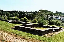 Von der rund 157 × 130 Meter (= 2 Hektar) großen Befestigungsanlage untersuchte die Reichs-Limeskommission hauptsächlich Teile des Grabens, der rund 1,20 Meter breiten Umfassungsmauer, das rechte und rückwärtige Tor, sowie das Fahnenheiligtum in den Principia, dem Stabsgebäude. Es konnte aufgrund der Nachgrabungen Nubers im Jahr 1972[16] festgestellt werden, dass die Anlage von drei[17] hintereinander liegenden Spitzgräben umgeben ist, die an den vier Zufahrten aussetzten. Die Abstände zwischen diesen Gräben fielen unterschiedlich aus; so war der äußerste und mittleren weiter voneinander entfernt als der mittlere vom innersten.