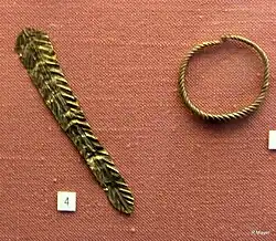 - ↑ Material/Technik: Kollier: Glasperlen, profilierte Goldblechzylinder; Fuchsschwanzkette mit Amulettkapsel: Gold; Halskette: Gagat, Glasflussperlen; Ohrringe: Goldblech, Goldraht, Lapis; Münzen: Bronze, Silberüberzug. Maße: Kollier: L 40 cm; Fuchsschwanzkette: L 44 cm; Kapsel: L 5,2 cm; Ohrringe: H 1,3 cm, B 1,4 cm, hergestellt vermutlich 3.–4. Jahrhundert n. Chr.