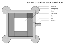 Die Ecken dieses Gebäudegevierts können durch Türme verstärkt sein. Oft befindet sich ein zusätzlicher Mauerzug vor dem Gebäudekomplex, an dessen Ecken runde Bastionen ein Bestreichen der Seiten ermöglichten.