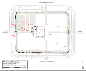Von der Innenbebauung wurden 1977, bei den Erkundungen am Westtor, zwei Holzbauten angeschnitten. Daneben vermaß man die Via sagularis, die Lagerringstraße, mit einer Breite von 3,3 Metern.[20]