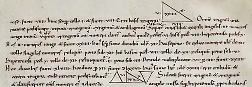 Beispielhaft zeigt ein handgeschriebenes lateinisches Geometrie- und Landvermesser-Lehrbuch, dass es zwischen dem 13. und dem 26. Juni 1004 geschrieben worden ist. Der Schreiber Constantius, ein Priester des Sankt Peter-Klosters in Luxeuil in den Vogesen, notiert in der Schlussschrift, im Kolophon, dass er die Arbeit innert 11 Tagen vollbracht habe. Das Lehrbuch ist in karolingischer Minuskel auf Pergament geschrieben, auf 18 Blättern im Format ca. 36,5 × 28,5 cm. Sehr schön ist auf der ersten Zeile von Blatt 10r ein Dreieck gezeichnet, das nach Pythagoras (6. Jh. vor Chr.) mit dem Seitenverhältnis von 3:4:5 rechtwinklig ist; hier mit römischen Zahlen VI, VIII und X bezeichnet; eingeschrieben ist die Zahl XXIIII (24), welche den Flächeninhalt bezeichnet. Die Handschrift gehört seit 1632 der Burgerbibliothek Bern, ein Geschenk des Berners Jakob Graviseth (1598–1658), der die berühmte Bibliothek seines Taufpaten, des Gelehrten Jacques Bongars (1556–1614) geerbt hatte.[2] Die ganze Handschrift ist digital faksimiliert zu sehen in e-codices[3], das Kolophon des Schreibers Constantius mit Datierung und einem Bücherfluch auf Diebe f. 17verso.[4] Auch im Katalog der datierten Handschriften der Schweiz ist die Handschrift verzeichnet.[5]