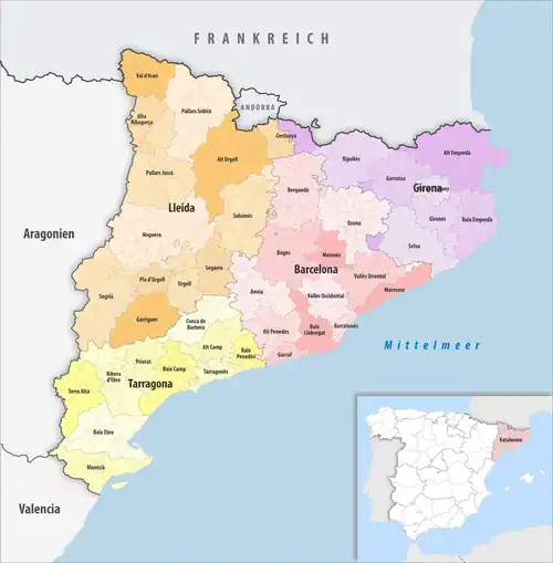 Katalonien ist administrativ in Provinzen, comarques und Gemeinden gegliedert. In Zukunft sollen die vegueries an die Stelle der Provinzen treten.