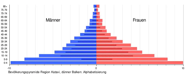 Im Jahr 2012 waren fast fünfzig Prozent der Bevölkerung unter 15 Jahre alt, weniger als vier Prozent waren älter als 60. Die Alphabetisierung betrug 60 Prozent bei Männern und 52 Prozent bei Frauen, der Prozentsatz war in städtischen Bereichen mit 71 Prozent deutlich über den 51 Prozent der ländlichen Bereiche (Stand 2012).[8]