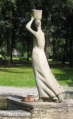 Der Bezirk Neukölln stattete 1956/57 den Parkfriedhof mit fünf Schöpfstellen aus, die mit Skulpturen verschiedener Bildhauer verziert wurden. Während die anderen Künstler für ihre Motive Tierfiguren wählten, blieb Katharina Szelinski-Singer auch hier ihrem zentralen Thema treu und erstellte eine Frauengestalt. Eine schwungvoll ausschreitende Frauenfigur trägt auf dem Kopf einen Wassereimer, den sie mit beiden Händen hält. Die Kunststeinfigur krönt zwei Becken mit Travertinabdeckungen, die in der Höhe leicht abgestuft ineinandergesetzt sind. Die Länge des Gesamtwerks beträgt 2,50 Meter, die Breite gleichfalls 2,50 Meter und die Höhe 1,80 Meter. Die Wasserträgerin blieb für 13 Jahre der letzte öffentliche Auftrag für Szelinski-Singer.