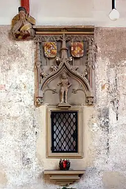 Die Schlusssteine des Gewölbes zeigen die segnende Hand Gottes und den Stern von Bethlehem. Die Konsolen unter den Gewölberippen sind halbfigurig als breitgeflügelte Engel ausgearbeitet, darüber zwei von Spruchbändern umschlungene Prophetenköpfe.