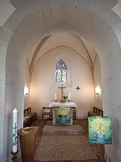 Der Innenraum ist schlicht ausgestattet. An den Wänden des Chorraums sind Reste spätmittelalterlicher Malerei erhalten, unter anderem ein Weihekreuz, aber nur fragmentarisch freigelegt. Unter dem nordwestlichen Chorfenster ist eine schlichte hochrechteckige Sakramentsnische erhalten. Im Chorraum steht um eine Stufe erhöht ein quaderförmiger Altar aus rotem Sandstein, der von einer Platte abgeschlossen wird. Darauf befinden sich ein hölzernes Kruzifix des Dreinageltypus, zwei schlichte Kerzenständer und die Altarbibel von 1965. Links im Triumphbogen ist eine sechsseitige hölzerne Taufe mit Messingschale aufgestellt. Die Taufschale zeigt in der Mitte eine Taube und auf dem Rand das Wort Jesu: „Lasset die Kindlein zu mir kommen“ (Mk 10,14 ). Rechts im Bogen steht ein Lesepult mit gedrechseltem Fuß.