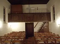 Der flachgedeckte Westteil wird von einer dunklen Holzdecke abgeschlossen. Zwei Reihen mit je vier Holzstühlen lassen einen Mittelgang frei. Die schmale, hölzerne Westempore mit Holzlamellen dient als Aufstellungsort der kleinen Orgel.