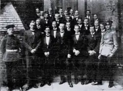 Nach dem Bestehen der Notprüfung zogen, nach dem Erinnerungsfoto am Morgen, die ersten kriegsfreiwilligen Oberprimaner der Schule in den Ersten Weltkrieg.