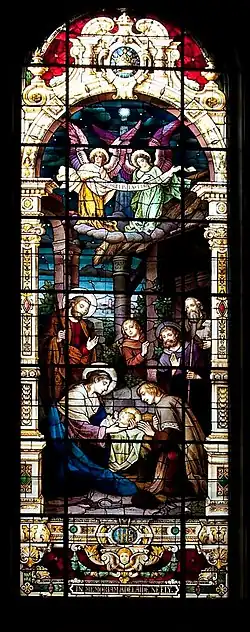 Den auffälligsten Teil der Ausstattung bilden die in München gefertigten Buntglasfenster. Die zwölf Hauptfenster an den Seiten sind ungefähr 2,4 Meter breit und 7,0 Meter hoch. Sie zeigen verschiedene Marienereignisse, die Maria in das Leben ihres Sohnes Jesus einbeziehen. Hinzu kommen weitere Bilder neben dem Portikus und im Foyer.[4]