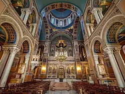Das Innere ist reich mit Fresken, Ikonen und Steinmetzarbeiten geschmückt, deren Stil sich an den byzantinischen Formenkanon anlehnt. Wichtige Heiligtümer sind die Schreine der heiligen Philothea († 1589) und des Patriarchen Gregor V. († 1821), die als Märtyrer für die Freiheit Griechenlands und der Orthodoxie verehrt werden.