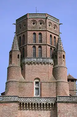 Der gesamte Bau ist – nach tolosaner Vorbildern – im Wesentlichen aus Mauerziegeln erbaut; der von weither herbeizuschaffende und deshalb teure Sandstein findet sich an einigen Gesimsen und Ecksteinen oder an den Säulen, Kapitellen oder Archivolten des Portals. Im Außenbereich der Wände, v. a. im unteren Bereich des Glockenturms, sind überdies einige Bruchstücke aus Sandstein vermauert, die möglicherweise vom Abriss der älteren Kirche stammen und hier als Spolien weitere Verwendung fanden.