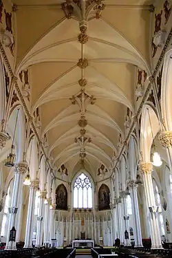 Die Kirche aus örtlichem Kalkstein ist eine an Vorbilder der englischen Gotik angelehnte querschifflose Pseudobasilika mit Kreuzrippengewölbe. Die Portalfront (im Süden) ist als Querriegel mit quadratischem Mittelturm gestaltet.