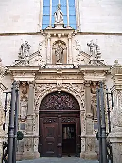 Das Bauwerk ist ein bemerkenswertes Beispiel der Spätgotik, weist jedoch verschiedene, vom Renaissancestil und vom Frühbarock beeinflusste Elemente und Verzierungen auf. Die historische Hauptfassade liegt in der Rue Notre Dame (Nordseite) und besitzt ein prächtiges Eingangsportal (bezeichnet 1621), geschaffen von dem Bildhauer Daniel Müller († 1623) aus Freiberg in Sachsen. Im Giebel befindet sich das monumentale Wappen von Erzherzog Albrecht VII. von Habsburg, der zur Zeit der Erbauung Regent der Spanischen Niederlande war, zu denen Luxemburg damals gehörte. Den ursprünglichen Chor zierte ein Gewölbeschlussstein mit dem Wappen des Orvaler Abtes Bernard de Montgaillard (1563–1628). Er war vermutlich finanziell an der Errichtung beteiligt.[6] Beim Neubau des Chores (1935) wurde der Wappenstein als Spolie in die darunter angelegte Krypta versetzt.