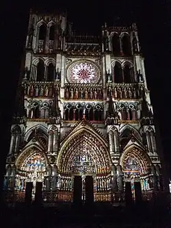 In Abweichung vom üblichen Bauablauf wurde in Amiens beim Bau der Kathedrale mit dem Langhaus begonnen und nicht mit dem Ostchor. Verglichen mit Notre-Dame de Paris steht die Westfassade vor einem höheren Kirchenschiff, aber die Türme sind nur halb so breit. Ungeachtet dieser unterschiedlichen Proportionen ist die Aufteilung ähnlich: Die große Fensterrose liegt weit oben, günstig für die Ausleuchtung des Mittelschiffs. Die Königsgalerie liegt darunter, günstig für die Erkennbarkeit der Skulpturen. Abweichend von der Pariser Kathedrale wurden die Portale mit Wimpergen geschmückt und zwischen Portalzone und Königsgalerie eine Zwerggalerie eingefügt. Die Wimperge entsprechen der zunehmenden Freude an Prachtentfaltung. Die Zwerggalerie ermöglichte es, ohne kahle Wandfläche die Königsgalerie so hoch zu legen, dass sie nicht von den Wimpergen verdeckt wurde. Diese Fassade bietet den größten Reichtum an Statuen, seit ihrer Entstehung in ihrer vollkommenen Ordnung erhalten sind.
