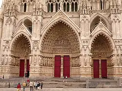 - ↑ Hochgotik im Sinne von Gotik mit ausgereiftem Maßwerk. Die Kathedrale von Chartres hat (in der Originalausstattung) noch kein richtiges Maßwerk und gehört daher der Frühgotik an. Die Kathedrale von Reims ist Pionierbau in Sachen Maßwerk, aber noch kein Gothique rayonnant, siehe Stilphasen der Gotik in Frankreich und Deutschland
