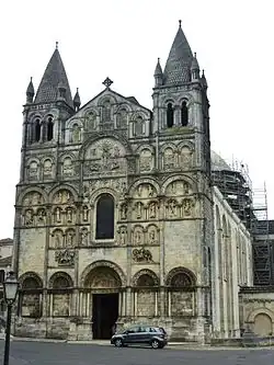 Der Bau der Kathedrale begann, im Gegensatz zu der üblichen Kirchenbauweise mit der Errichtung der Fassade. Sie zeigt unter den romanischen Werken ihrer Art in Frankreich den größten Umfang und reichsten Dekor. Allerdings hat sie durch eine 1866–1875 von Paul Abadie durchgeführte Restaurierung gelitten. Dazu schrieb Marcel Durliat, einer der renommiertesten Kenner der romanischen Kunst in Frankreich: „Paul Abadie hat die Westfassade genauso pietätlos behandelt [wie den Innenraum]. Mit prächtiger Ungeniertheit hat Abadie hier nachgeschnitten, dort vervollständigt, ein Mittelportal rekonstruiert, das ihm unbekannt war, und besonders das ganze durch eine vollkommen unpassende Bekrönung kopflastig gemacht.“[1]